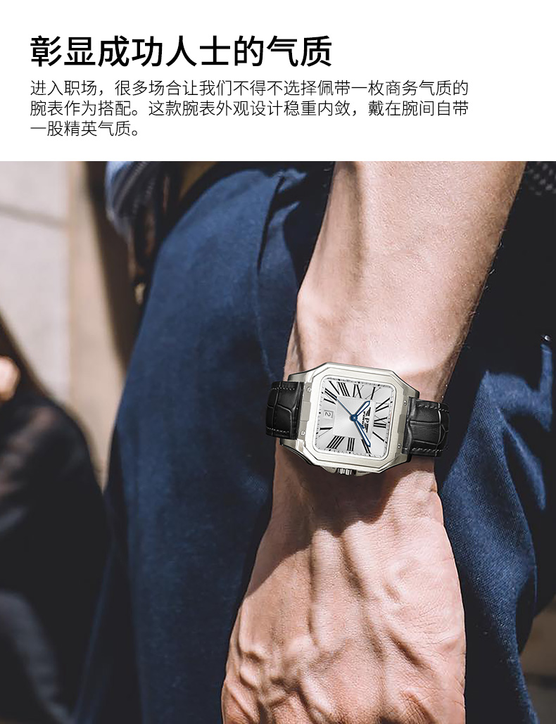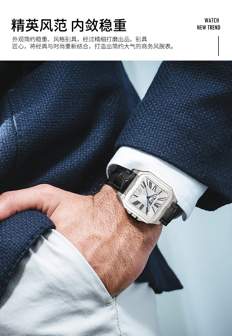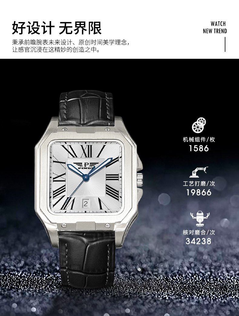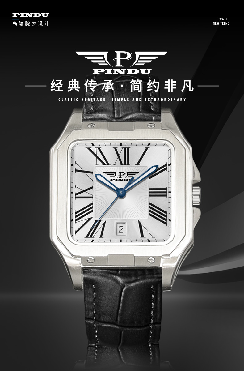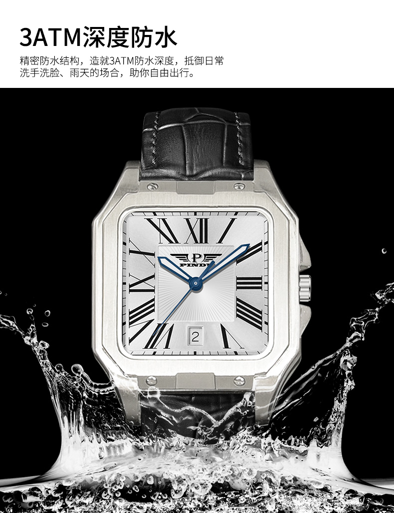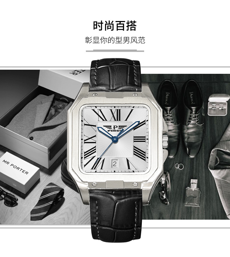 品度(PINDU-6515)官方正品坦克方形手表男士防水手表方型自动机械腕表