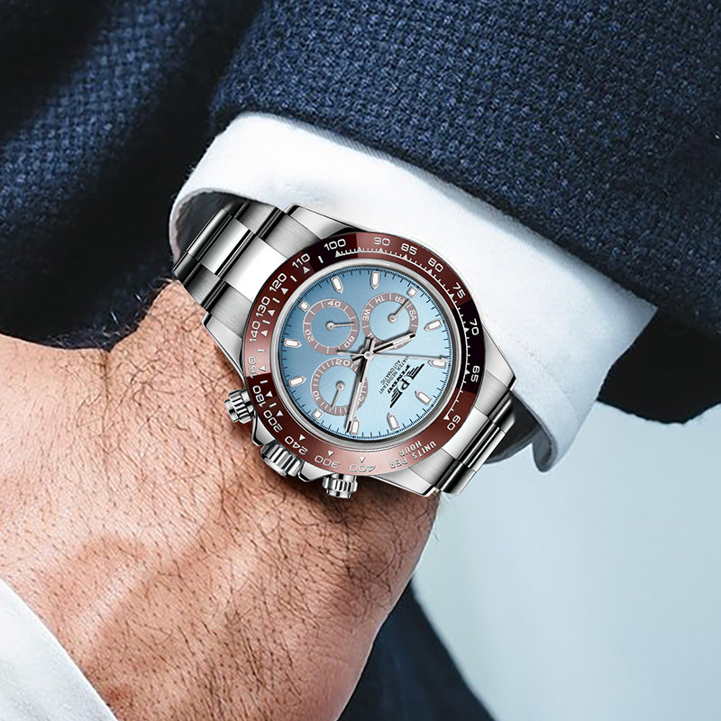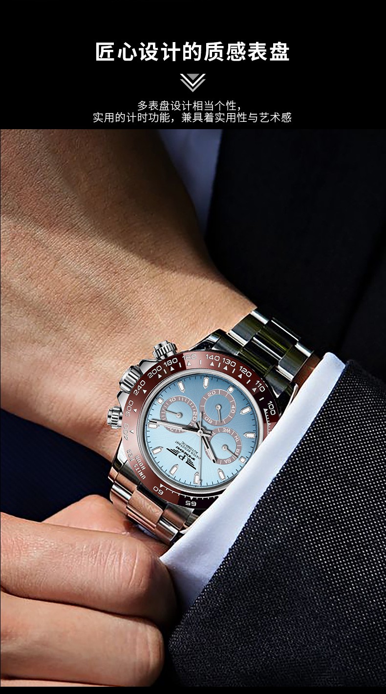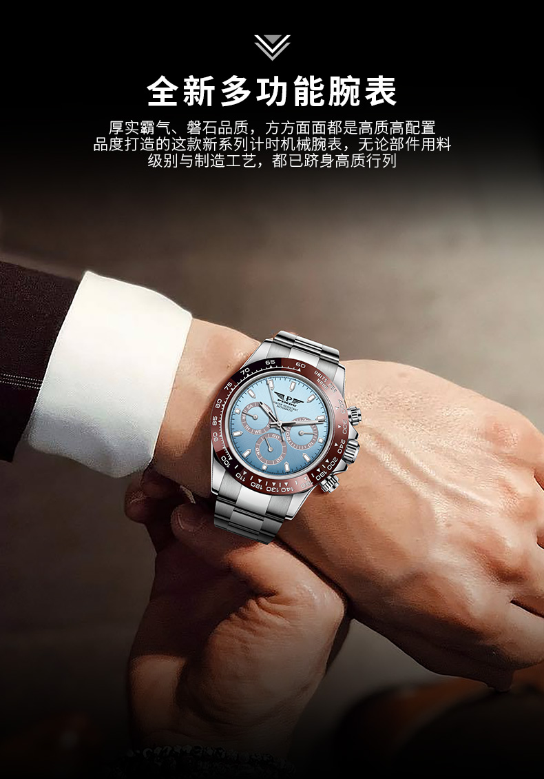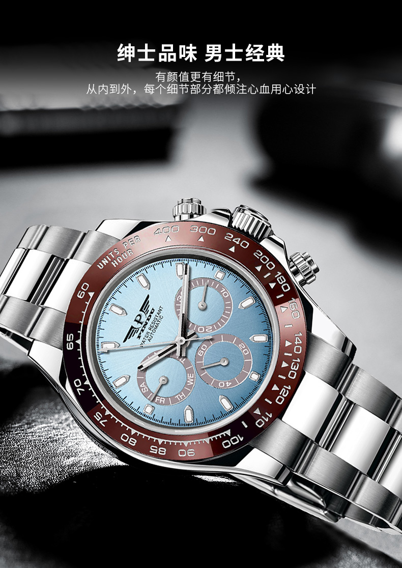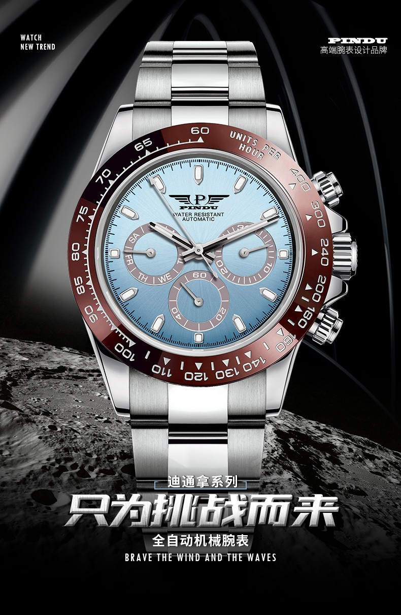 品度(PINDU-6505)蓝面迪通拿手表多功能夜光全自动机械表