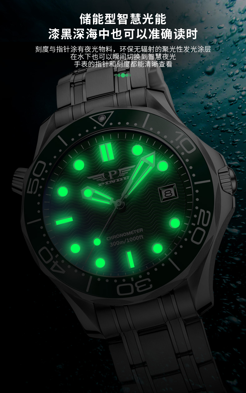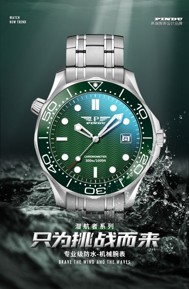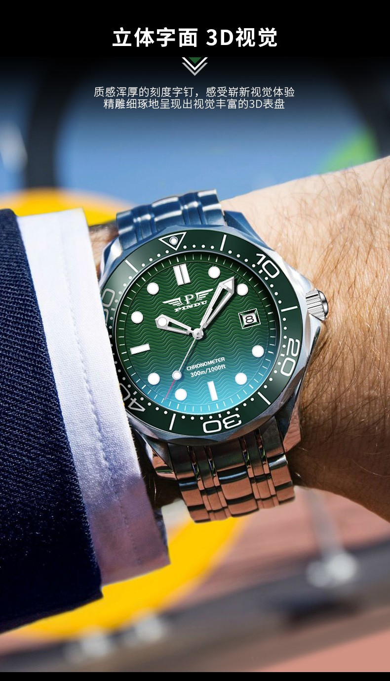 品度(PINDU-6508)正品绿色海马手表男士运动自动机械腕表