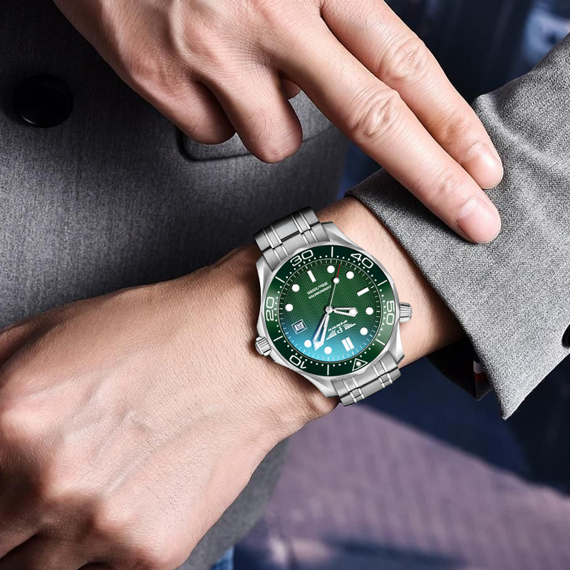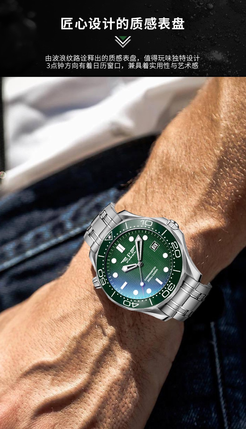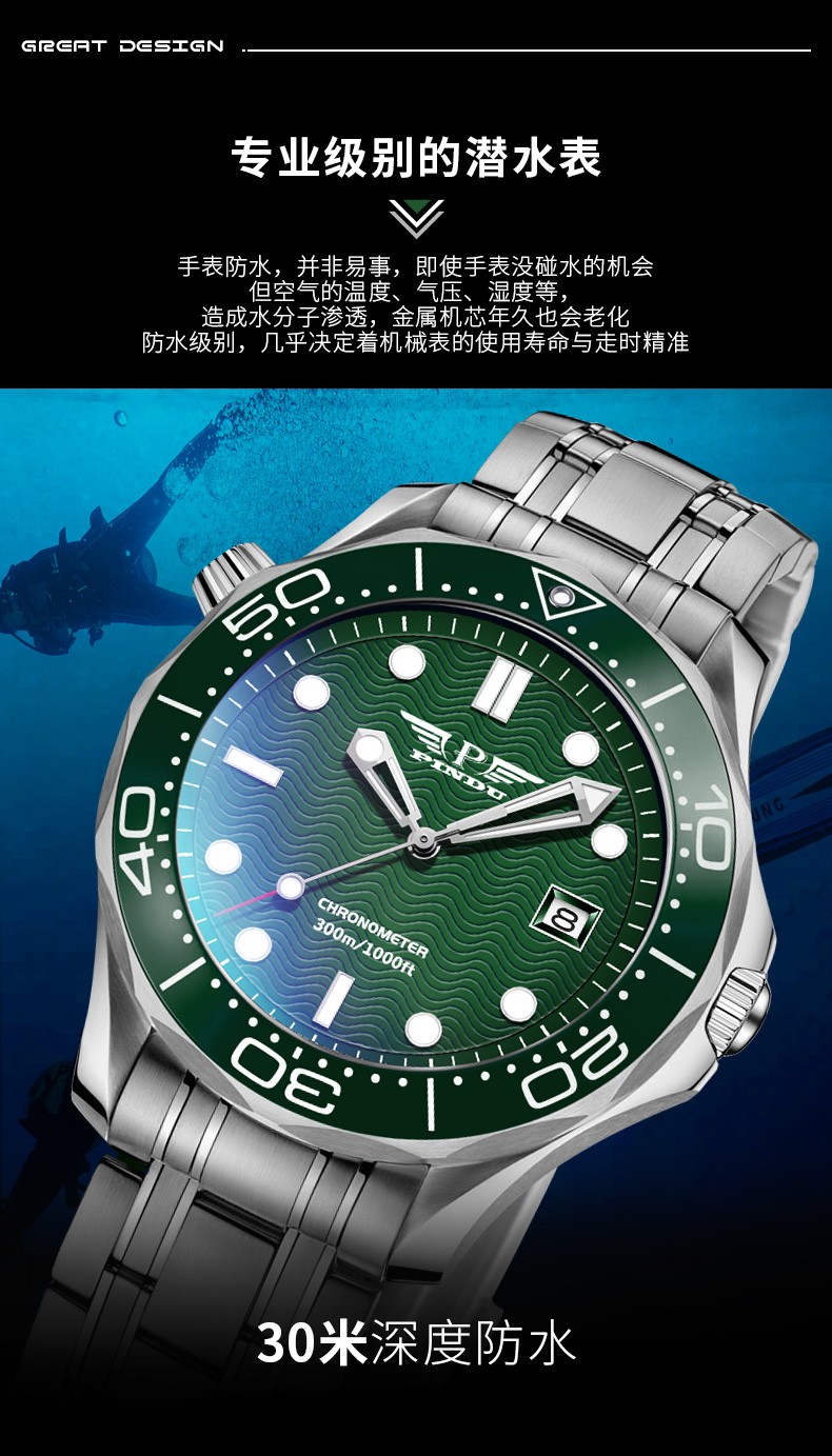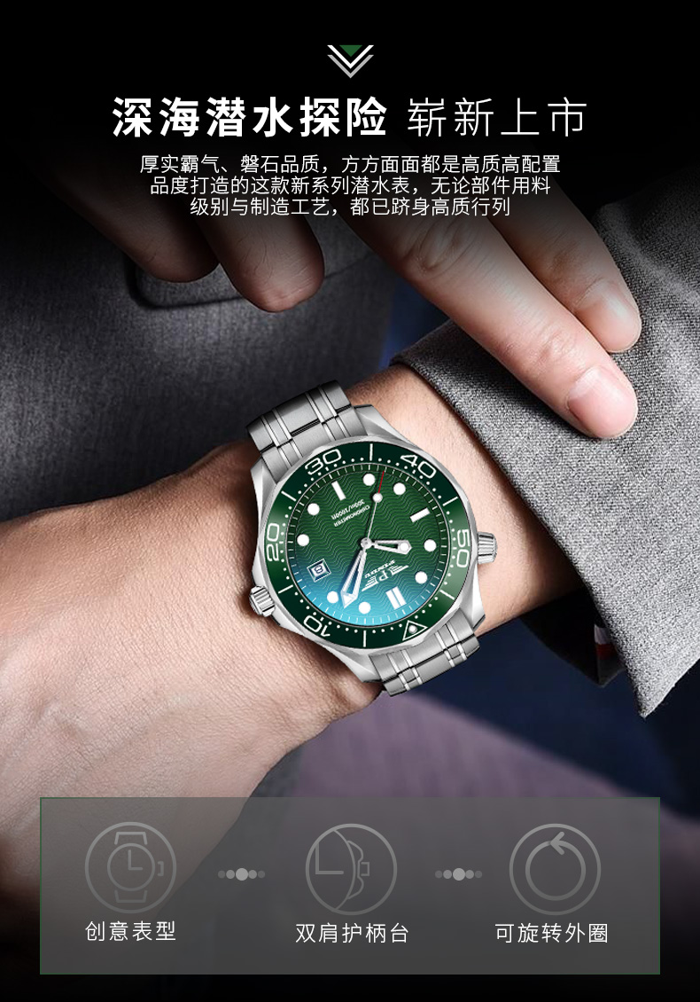 品度(PINDU-6508)正品绿色海马手表男士运动自动机械腕表